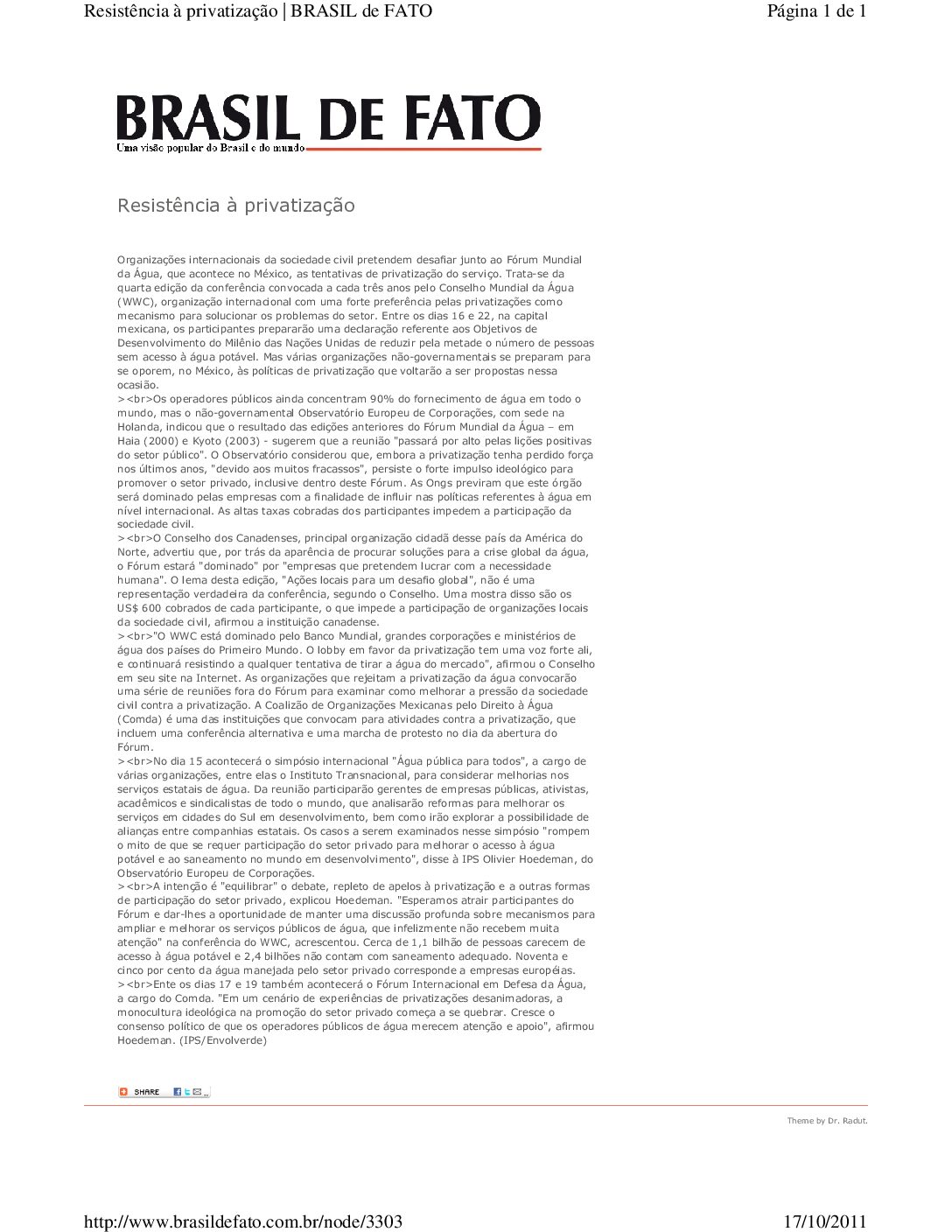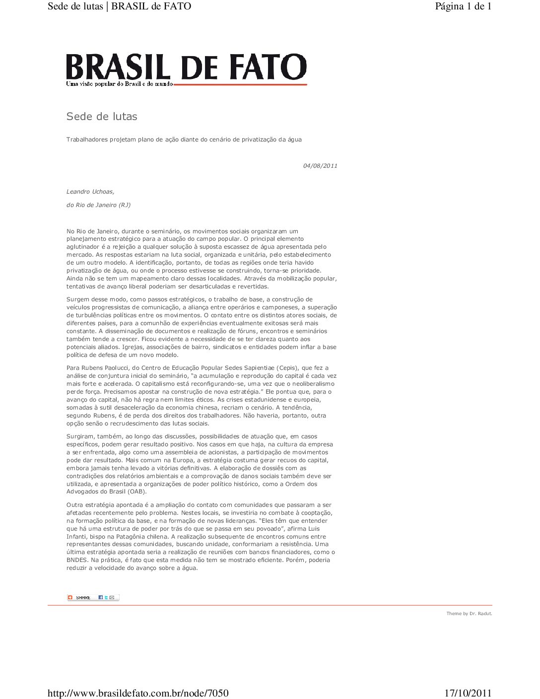 Pode ser a gota d’água Documento podesergotaagua Baixar Anexos sedelutas resitprivatizacao MetadadosTítuloPode ser a gota d’águaAutoriaLeandro UchoasOutros assuntosAcesso à agua | PrivatizaçãoAno de PublicaçãoDécada de 2010 > 2011Data de publicação2011Tipo de documentoReportagemLocal de publicaçãoBrasil > Sudeste > Rio de JaneiroEditor(a) ou InstituiçãoBrasil de FatoDescriçãoReportagem - Avançam na América Latina iniciativas de privatização da água. Movimentos e ongs progressistas debatem estratégias de resistência Item anteriorSOCIEDADE CIVIL, ENTRE O POLÍTICO-ESTATAL E O UNIVERSO GERENCIAL Próximo itemEstados Unidos e América Latina: a construção da hegemonia