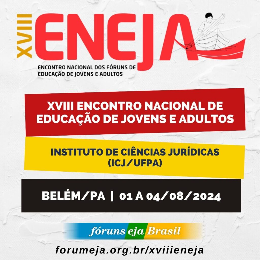 XVIII ENEJA é movimento de luta, resistência e proposições, é fruto de construção coletiva (debates) realizada pelos Fóruns de EJA do Brasil, ao mobilizar ações que fortalecerão a luta por uma Educação para pessoas Jovens, Adultas e Idosas com qualidade socialmente referenciada.